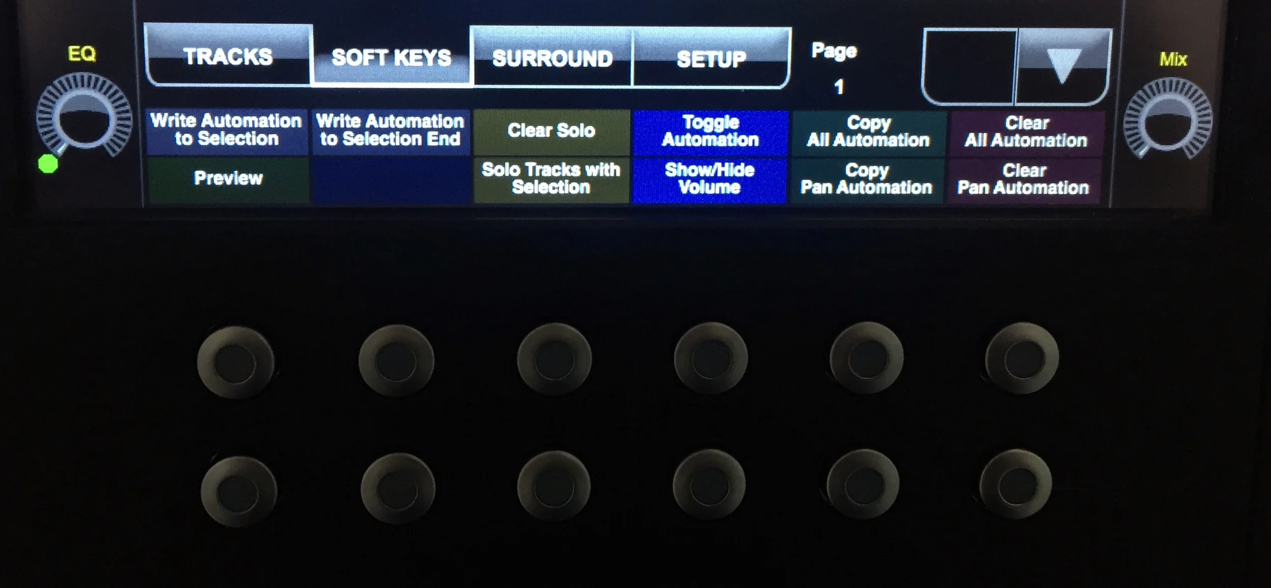My most used buttons on the Artist Control are the twelve physical soft key buttons located just below the touch screen. Mirroring the labeled touch keys just above them, these physical buttons are easy for me to utilize without ever needing to look down. I've personally customized Page 1 of these keys to bridge the gap where my Pro Tools key commands leave off. From automation window functions to advanced Copy and Clear functions, these two rows basically add a second keyboard to my rig.