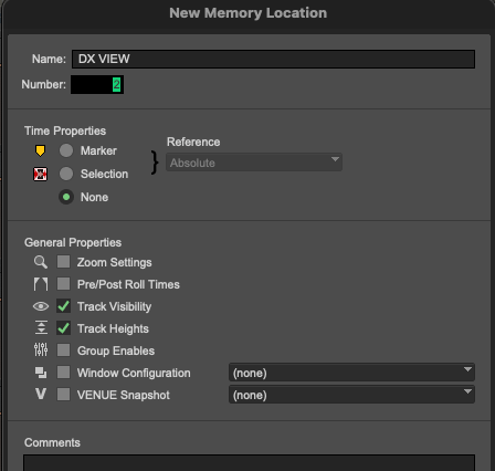 For me, the easier my session is to look at, the easier it is to focus on the work in front of me. Our sessions can become overwhelmed with so many tracks and so much audio, I find it can slow me down. Another way to reduce this clutter could be to use custom Track Visibility with memory locations. Use Numpad+Enter as you would with a Marker, but change the Time Properties to “none” and instead check Track Visibility.