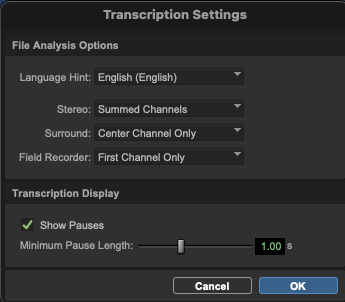 To get working with Speech to Text, you need to give Pro Tools some direction. The first time you try and transcribe a file, you’ll likely receive the following message: “Speech to Text Engine is not installed. Would you like to download and install it now?” Click yes and AVID takes care of the rest under the hood. Next, go to the Setup menu where you’ll find Transcription Settings which, among other tweaks, gives you the option to specify a language. You can certainly leave this on Multilingual, but in my tests, it is roughly 10x faster to clue the AI in on what language it’s listening for. As long as your project is not multilingual, choose a language and save yourself a ton of time.