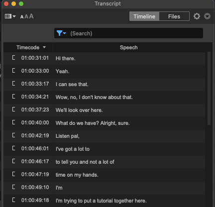 The Timeline view has a column for viewing timecode locations of each clip. It also gives you the option of seeing what track is attributed to each line of dialogue. If like us, you label your tracks by character, this can be a very handy reference. You can filter by track name and then search for specific keywords.