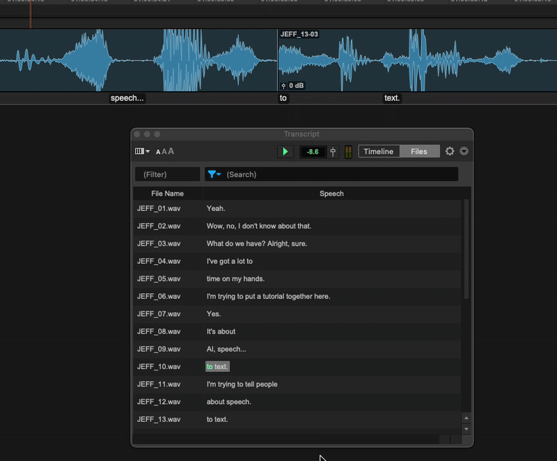 - Files View: Ideal for previewing, filtering, and dragging alternate takes directly into the timeline.Highly efficient for real-world use cases — instantly locate words like "wow" spoken by a specific character, audition options, and replace takes on the fly.