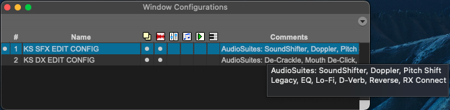 Start by opening your favorite AudioSuite plugins, meters, edit windows, etc. and position them where you like on your screen(s). Below are two examples (although you’ll need to set these up one by one): On the left I’ve set up my commonly used plugins for sound effects editorial, while on the right I’ve set up my configuration for dialogue editorial. I love the idea of setting up a configuration for each specific food group of sound editorial, or for mixing.