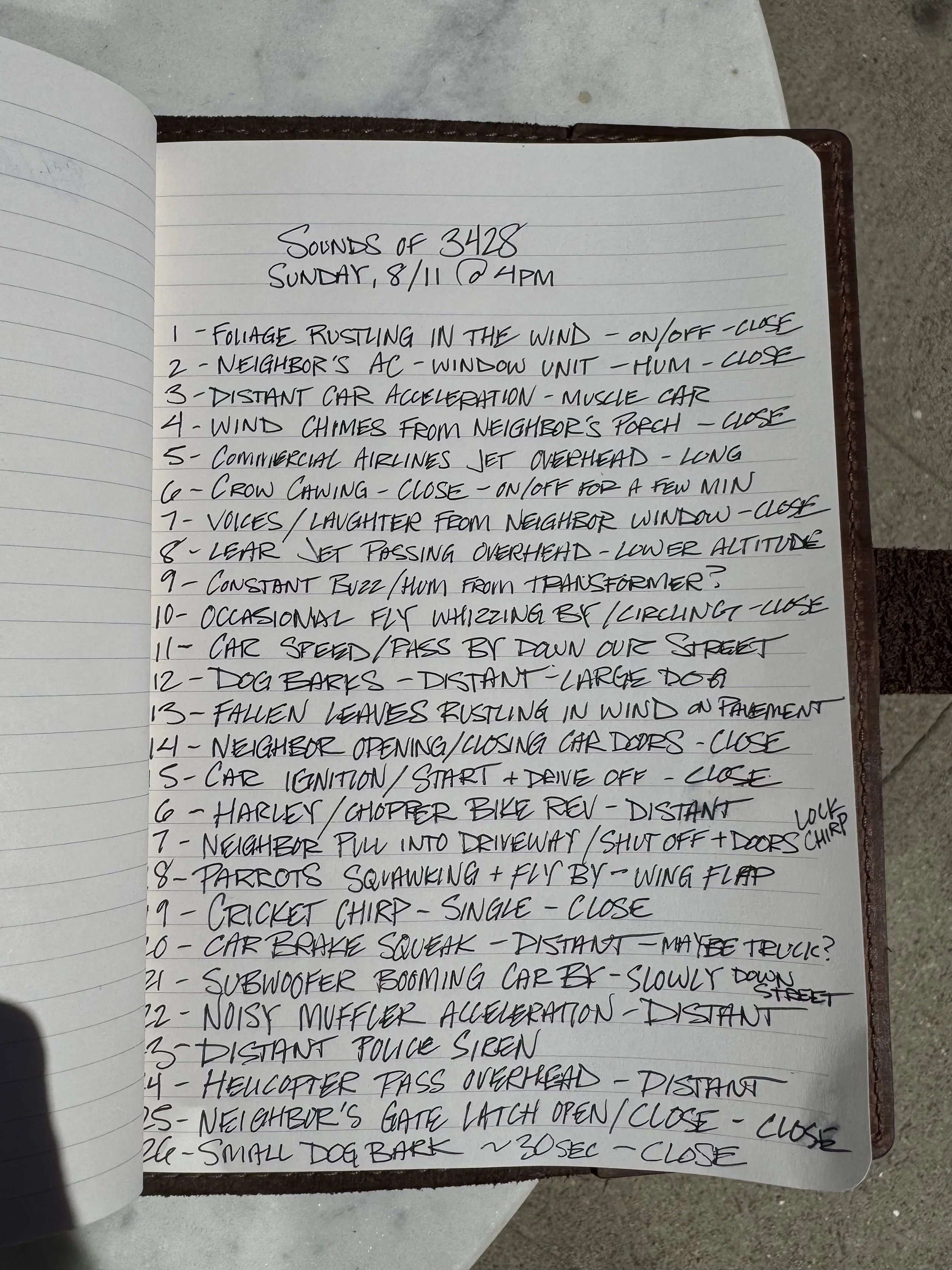 As sound editors and mixers, we spend our workdays in rooms isolated from the outside world, buried in our waveforms and plug-ins. But sometimes the most valuable exercise is simply stepping away from your workstation and listening to the world around you (check out this post from co-owner, Kate Finan on how taking quality breaks refill your attention “tank”). Recently, I sat outside in my neighborhood for an hour with a notebook and made a conscious effort to log every sound I heard. The goal wasn’t to record… it was to notice!